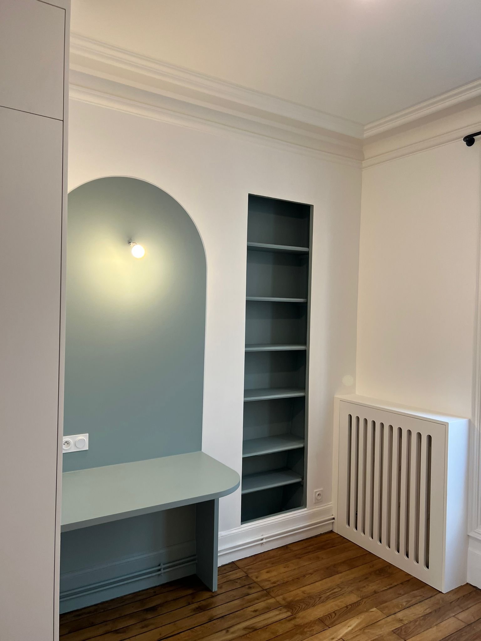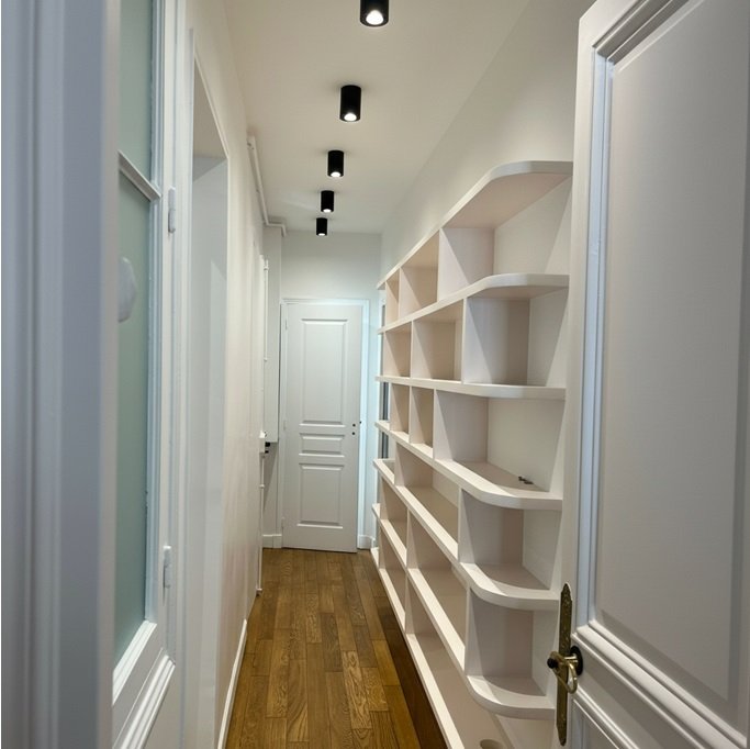 Pour optimiser cette nouvelle configuration, la menuiserie a joué un rôle central. Nous avons dessiné et réalisé des agencements sur mesure pour chaque pièce : ici une bibliothèque majestueuse qui habille le salon, là un espace bureau discret ou un dressing parfaitement intégré. Chaque rangement a été pensé pour se fondre dans le décor tout en maximisant la surface utile.